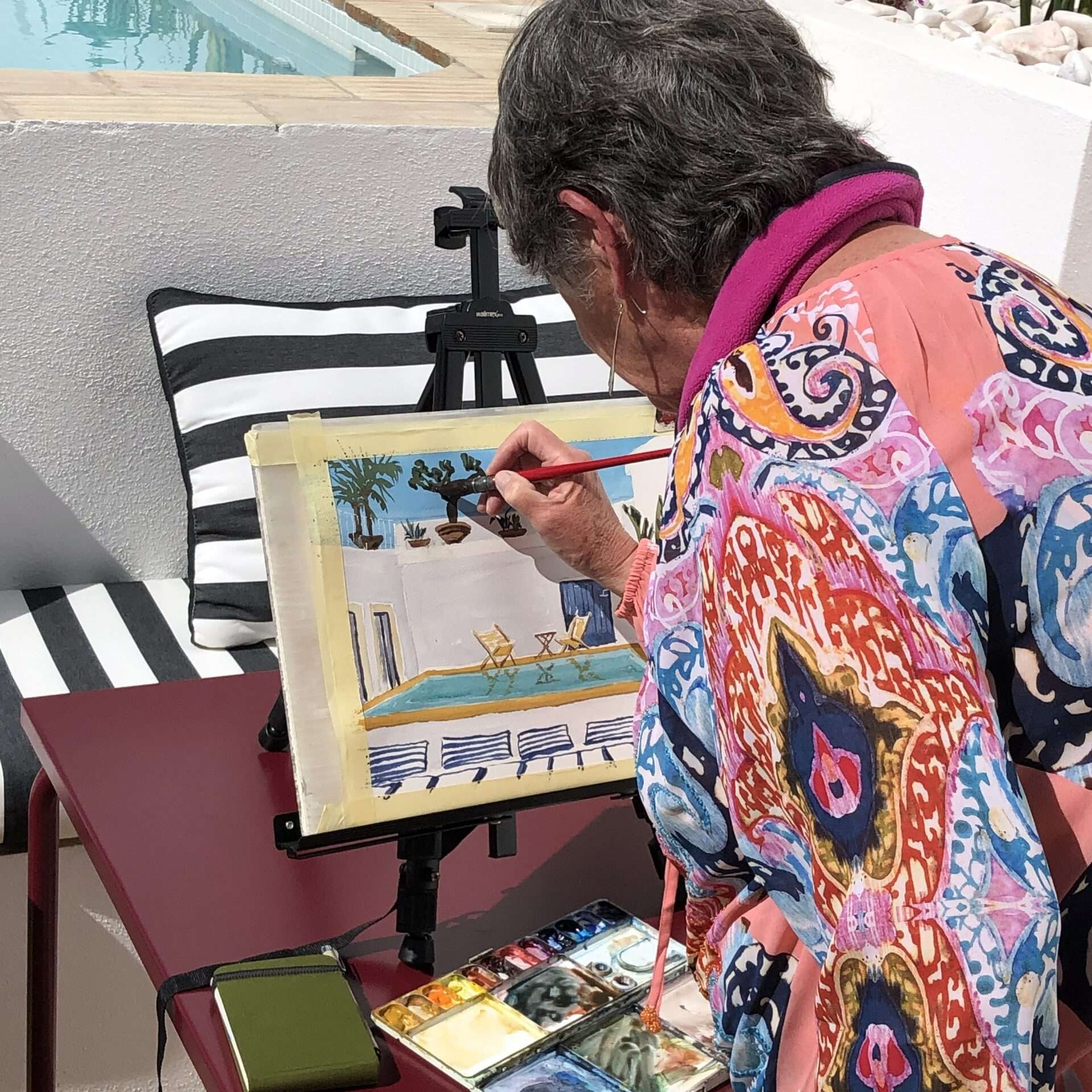 Dawn Oliver – With 27 years experience teaching drawing and painting classes to adults of all abilities and teaching painting holidays all over Europe for 25 years. Dawn has a fun approach and likes to demonstrate and share many techniques in watercolour which can be used for any level of painting experience throughout the holiday and indeed in future paintings.