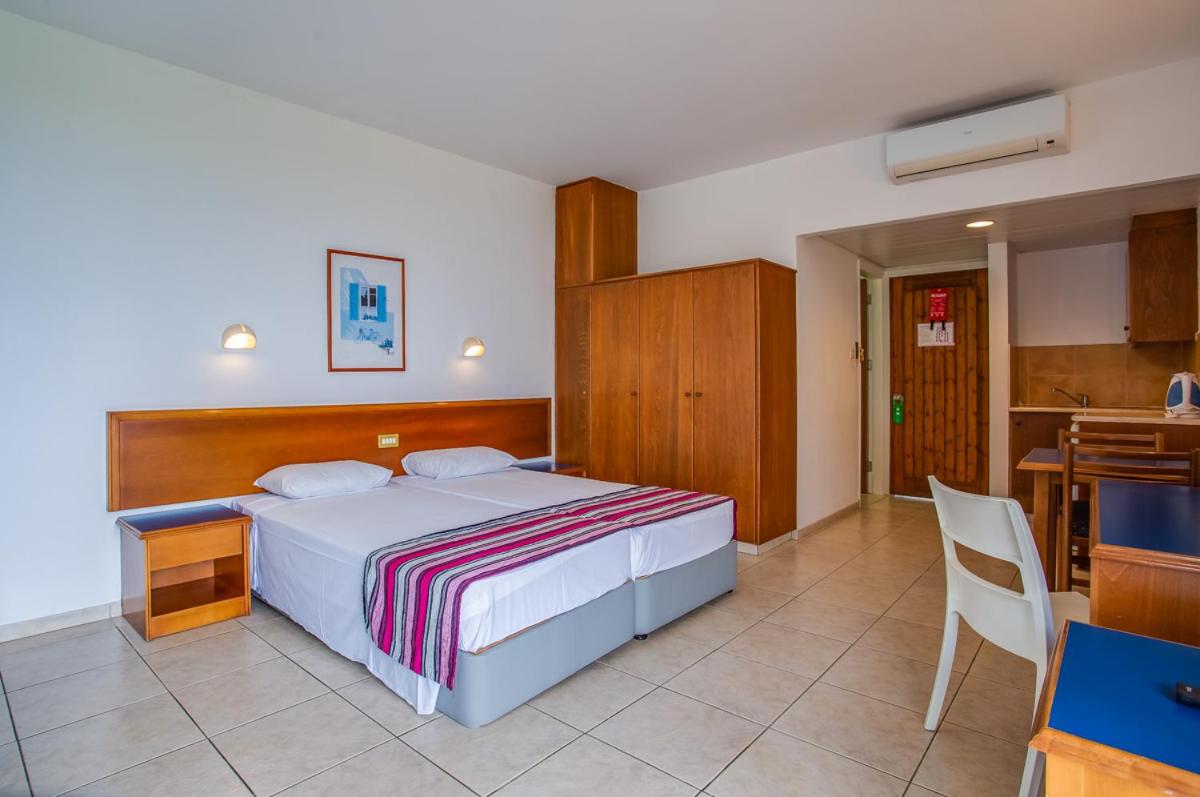 Eleni Holiday Village’s Garden View Studio rooms offer comfortable, spacious accommodation with modern amenities, overlooking lush gardens and a tranquil setting.