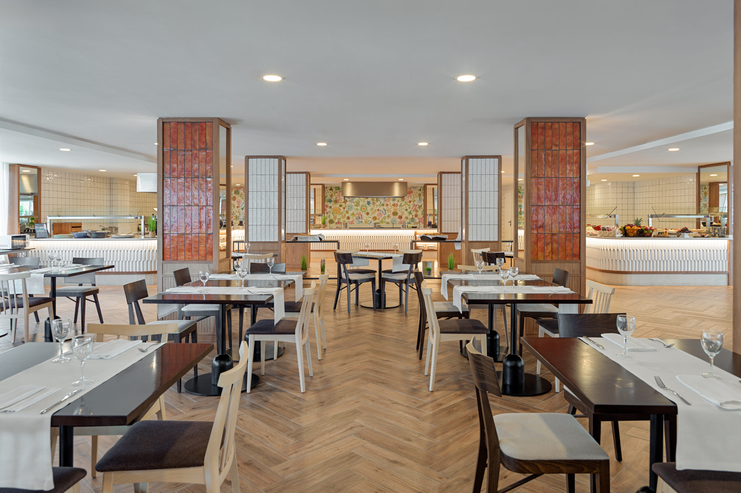 The hotel’s light and airy restaurant overlooks the pool, with tables spilling out onto the terrace. It offers an extensive buffet plus a show-cooking station.