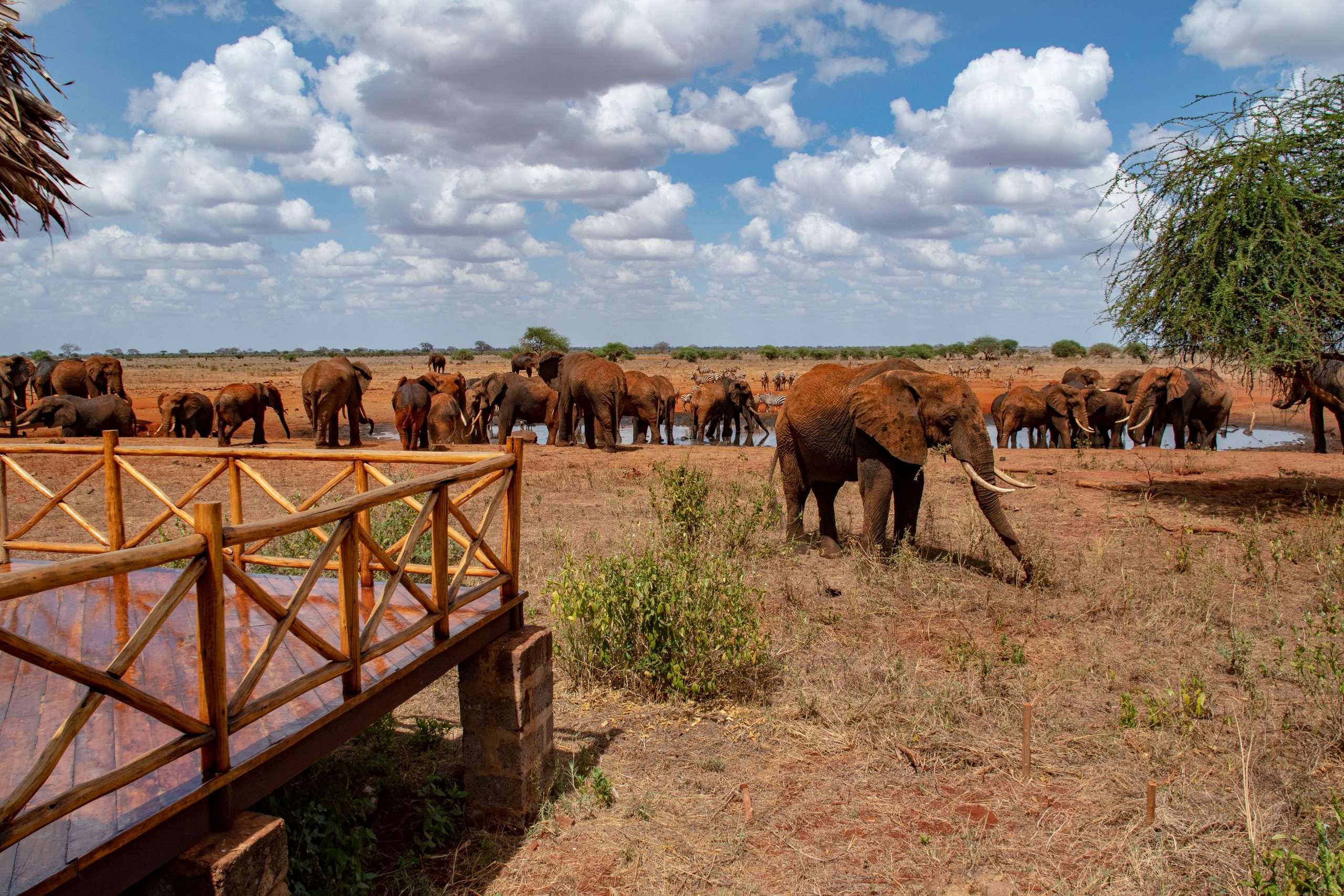 Ngutuni Lodge on Tsava East National Park, is en-suite with “makuti” rooms and overlooks the watering hole. A great spot for wildlife photographs of all of the animals drawn to there.