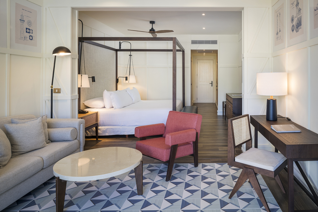 The spacious junior suites feature modern design, a living area with sofa, and a furnished balcony or terrace with garden views. Amenities include a bathtub, rain shower, daily restocked minibar, coffee maker, flat-screen TV, complimentary Wi-Fi, and air conditioning.